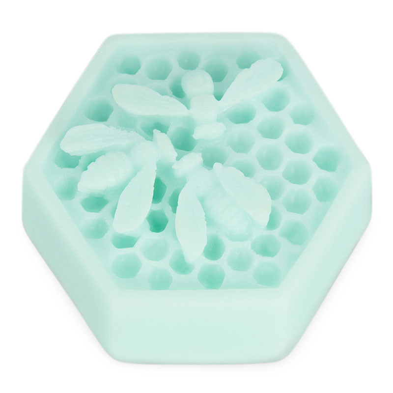 Wabenform mit Bienen, 5,5x6,2x2,2 cm, ideal für die Herstellung von schönen sechseckigen Wabenseifen mit drei Bienen im Relief. Sie ist perfekt für Imkereiliebhaber. Die Seifen lassen sich einfach und kostengünstig mit den Materialien in unserem Online-Shop herstellen. Es handelt sich um eine Silikonform, die nicht klebt, widerstandsfähig und flexibel ist und sehr einfach zu benutzen. Alles, was du tun musst, ist, die Seifenbasis zu schmelzen, aromatische Essenzen und Farbstoffe nach Geschmack hinzuzufügen und die Form zu füllen. Warte, bis die Seife fest wird, und entferne sie aus der Form. Die fertigen Seifen lassen sich mit Glimmer oder Seifenfarben verzieren - das Ergebnis wird toll aussehen! Mit dieser Form kannst du auch mit anderen Materialien wie Wachs, Gips, Zement, Harz auf Wasserbasis usw. arbeiten.