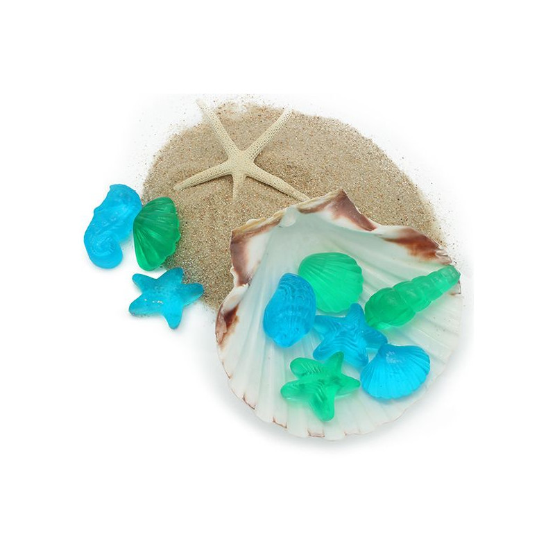 Mit diesem Set erhältst Du Seifen im Miniaturformat in Form von Muscheln, Seepferdchen, Seesternen... Die entstehenden Seifen sind je nach Figur zwischen 3 und 5 cm groß.