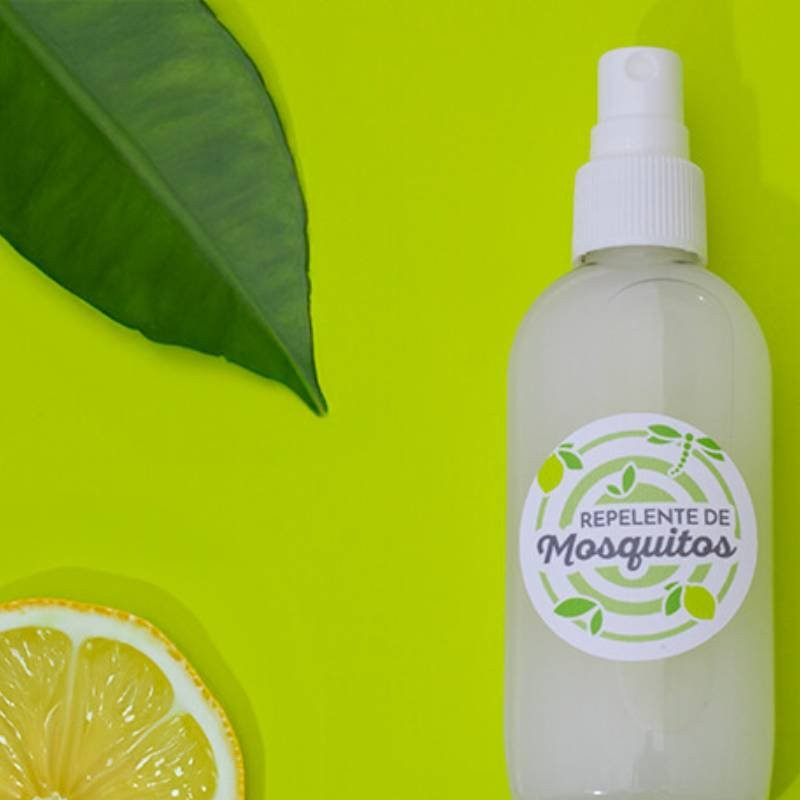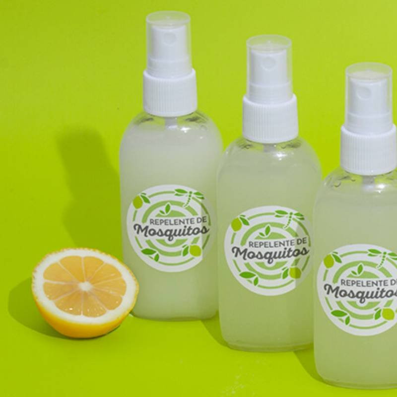 • Verpacke hausgemachtes Mückenschutzmittel in Flaschen mit Spray und dekoriere es mit Aufklebern.