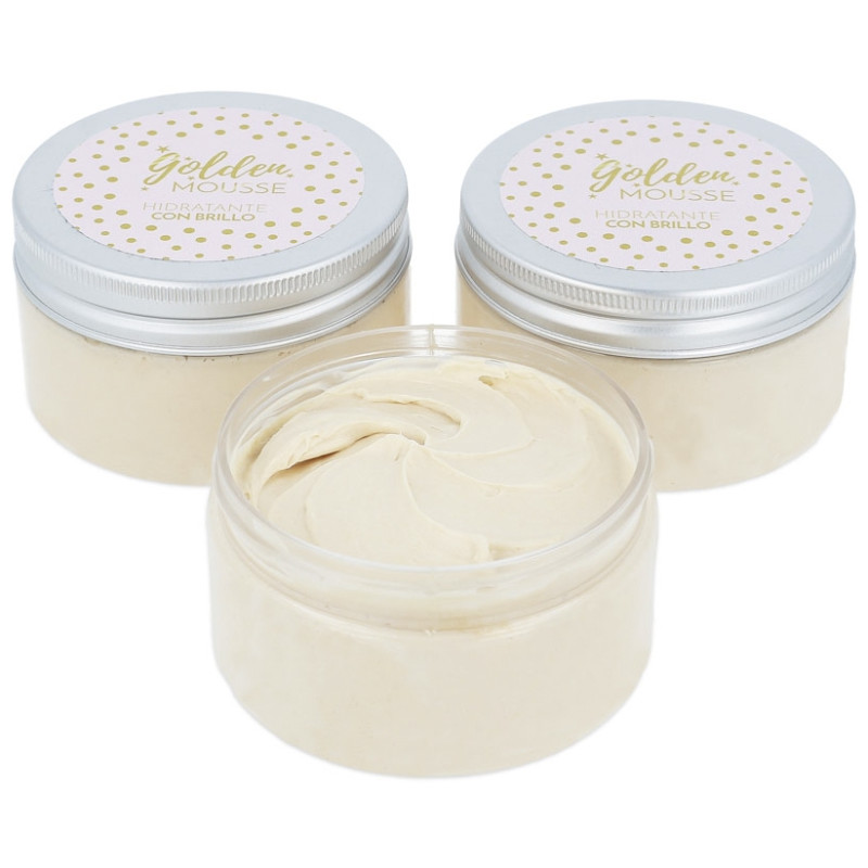 Damit deine feuchtigkeitsspendende Körpermousse gut riecht, enthält das Kit eine aromatische Essenz. Darüber hinaus wirkt Vitamin E als Konservierungsmittel, das verhindert, dass es ranzig wird. Schließlich hilft uns der goldene Glimmer, den zusätzlichen Glanz zu erhalten und eine hausgemachte goldene Mousse zu erzielen. Mit den Aufklebern und Behältern wird die Verpackung 10 sein, auf diese Weise wird Ihre hausgemachte Feuchtigkeitsmousse ein professionelles Finish erhalten.