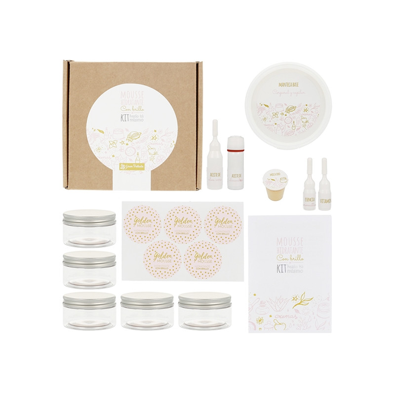 Entdecke, wie du selbst eine feuchtigkeitsspendende Mousse mit einem Hauch von Schimmer herstellen kannst, um deine Haut zum Strahlen zu bringen! Mit diesem Set von Gran Velada kannst du dieses Rezept ganz einfach zu Hause herstellen. Das Ergebnis? Eine goldene Mousse, die deiner Haut Feuchtigkeit spendet und dich bei besonderen Anlässen zum Strahlen bringt. Die Zutaten, die du brauchst, um dein eigenes Feuchtigkeitsmousse herzustellen, findest du in diesem Set: Basisbutter, pflanzliche Öle, aromatische Essenz, Vitamin E und Goldglimmer für den Glanz. Ebenfalls enthalten sind die Verpackung und das Schritt-für-Schritt-Rezept. Alles, was du tun musst, ist, es zu befolgen, um das feuchtigkeitsspendende Körpermousse herzustellen. Es ist ganz einfach: Man muss nur die Zutaten mischen und mit einem elektrischen oder manuellen Schneebesen aufschlagen, um eine schöne Mousse-Textur zu erhalten. Ein perfektes Set zum Verschenken!