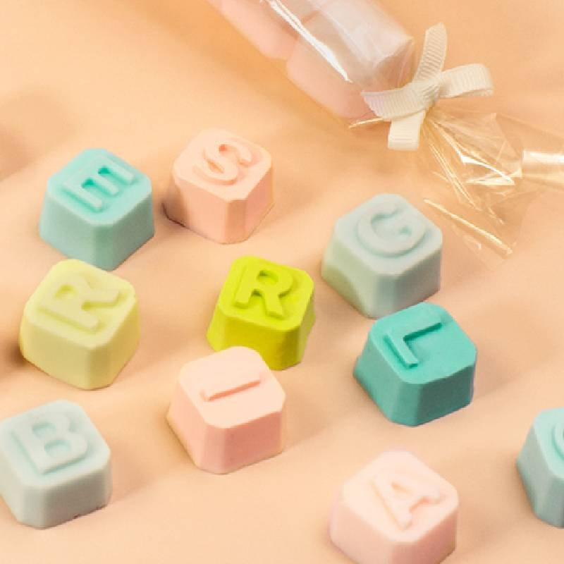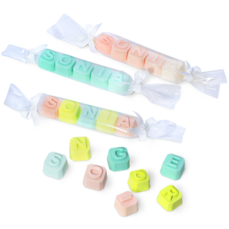 Ves como la producción de jabones personalizados está al alcance de todos. Tienes que repetir el proceso paso a paso para dar una letra a todos los jabones, utilizando cualquier número de colores que quieras. Puedes hacer cada letra de otro color y agregar más o menos color según tu preferencia para crear una paleta de colores de intensidad más fuerte a más débil.