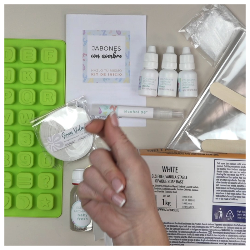 Encontrarás los siguientes materiales en el set para realizar jabones personalizados para primera comunión, bautizo u otro evento: