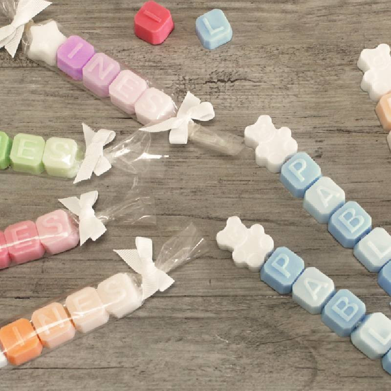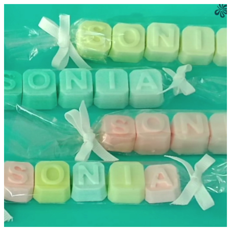 A la hora de hacer jabones personalizados para Primera Comunión es importante tener en cuenta lo siguiente: Con un kilogramo de base de jabón se pueden hacer unas 140 letras. Dependiendo del número de letras de un nombre, puedes hacer la cantidad adecuada de jabón. Por ejemplo, puedes hacer 28 jabones para un nombre de 5 letras, JULIA.