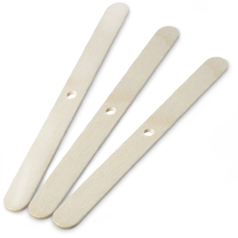 Dies ist ein länglicher Dochthalter aus Holz mit einem Loch in der Mitte. Diese Öffnung sorgt dafür, dass der Docht perfekt an seinem Platz und in der Mitte gehalten wird.