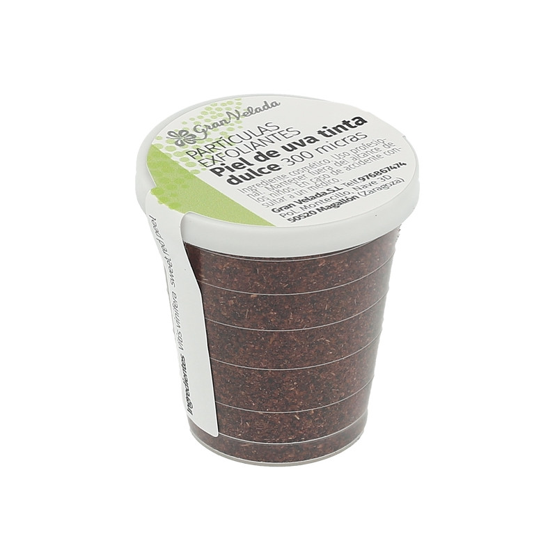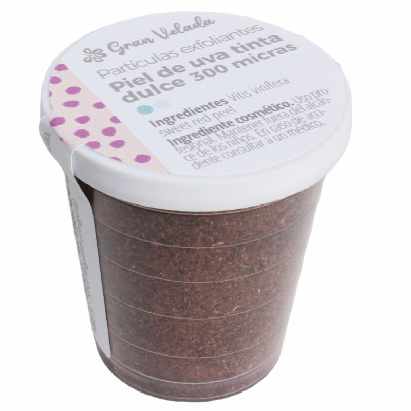 Die Peeling-Partikel der gemahlenen Traubenhaut, die Sie in Gran Velada kaufen können, enthalten eine große Menge an Mineralien wie Kalzium, Eisen, Zink ... Es ist auch reich an Vitamin E und anderen antioxidativen Wirkstoffen wie Procyanidinen B1, B2, B3, Cl, Catechinen oder Epicatechinen. Es enthält auch Revestratol.