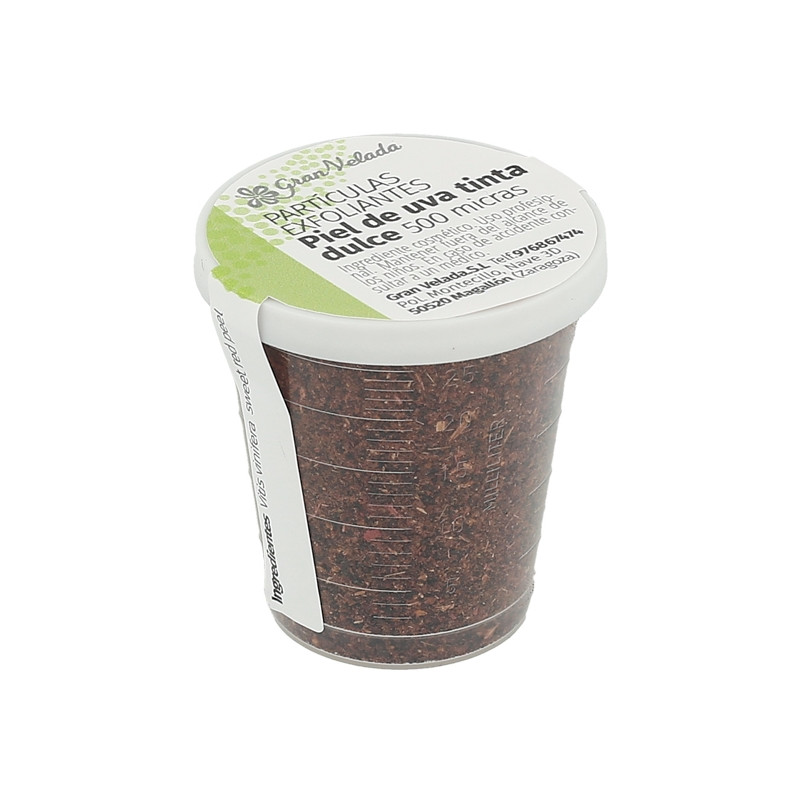 Die Peeling-Partikel der gemahlenen Traubenhaut, die Sie in Gran Velada kaufen können, enthalten eine große Menge an Mineralien wie Kalzium, Eisen, Zink ... Es ist auch reich an Vitamin E und anderen antioxidativen Wirkstoffen wie Procyanidinen B1, B2, B3, Cl, Catechinen oder Epicatechinen. Es enthält auch Revestratol.