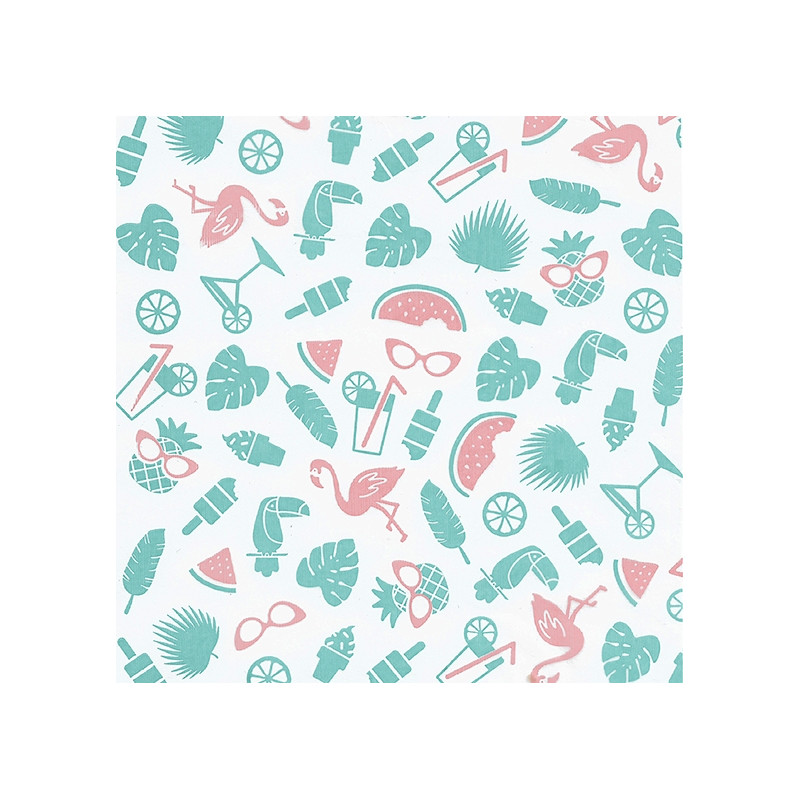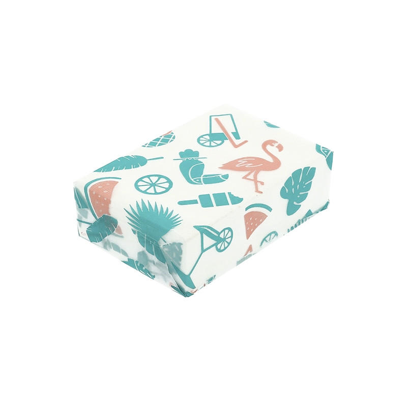 In Gran Velada finden Sie verschiedene Modelle von Wachspapier zum Einwickeln von Seifen. Dieser zeichnet sich besonders durch seinen koketten tropischen Print aus. Es ist ein durchscheinendes Wachspapier, das mit tropischen Drucken verziert ist. Die Töne von Wasser, Grün und Lachs stechen hervor.