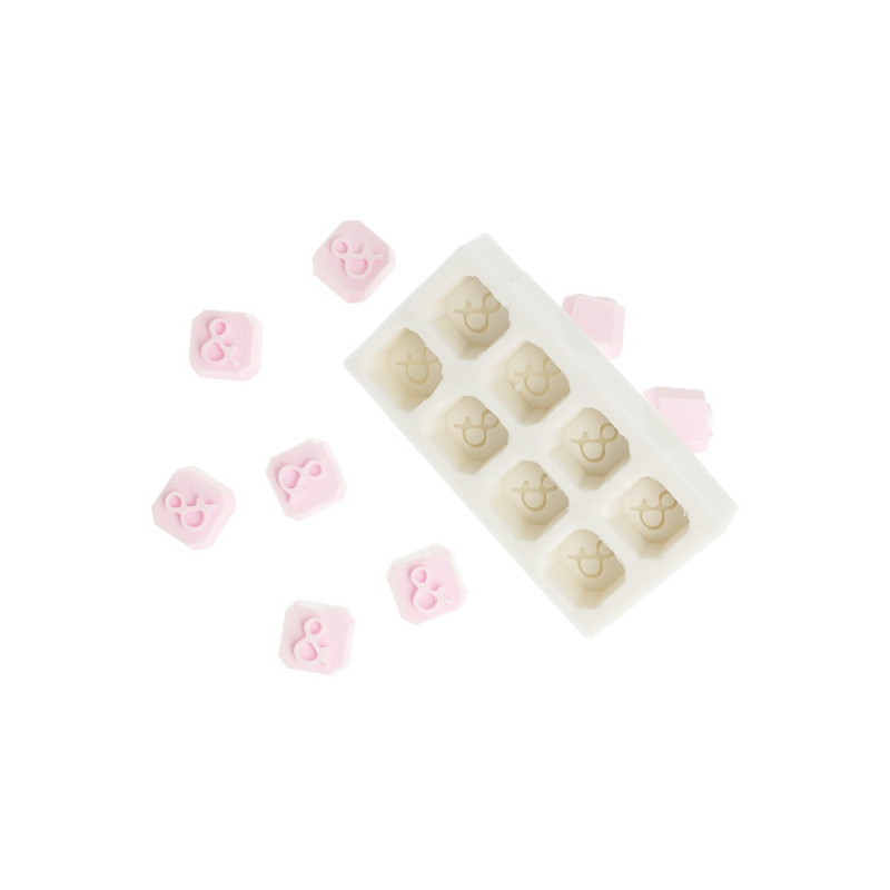 Silikon & Form mit 8 Kavitäten, speziell entwickelt, um die Buchstaben-Form zu ergänzen, die du auch in unserem Online Shop kaufen kannst. Mit dieser Form erhält man quadratische Formen, 2 x 2 x 1,5 cm, mit einer Prägung & einem Relief. Um die Form zu füllen, benötigt man etwa 56 Gramm, d.h. 7 Gramm pro Stück.