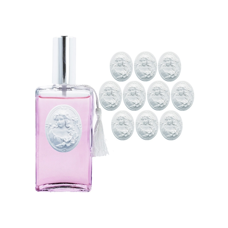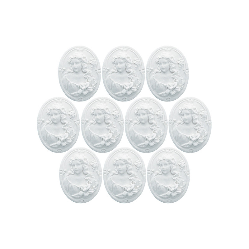 Kamee zum Parfümieren und Dekorieren, Modell Legnica, oval und Gips, 2,8 x 3,7 cm. Das Kameenmodell Legnica eignet sich perfekt zum Parfümieren und Dekorieren von Geschenken und Verpackungen . Es ist ein Cameo-Auftritt im Vintage-Stil und stellt die Figur einer jungen Frau mit langen lockigen Haaren mit romantischer Ausstrahlung dar. Diese Art von Gipskameen eignet sich ideal zum Dekorieren von Parfümflaschen, Mikados oder zum Verpacken von handgemachten Seifen. Sie können mit Bändern aller Art kombiniert werden, sowohl mit Organza als auch mit Satin bis hin zu rustikaleren. Auf diese Weise können Sie den einfachsten und einfachsten Behältern eine hervorragende Atmosphäre verleihen. Sie können sie auch mit Ihrem Lieblingsduft parfümieren. Die Legnica-Kamee wird in Packungen mit mehreren Einheiten verkauft. Wählen Sie diejenige, die Ihren Bedürfnissen am besten entspricht.