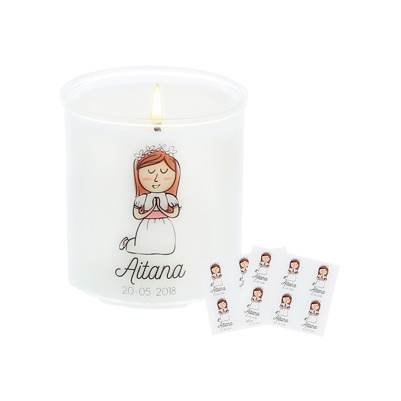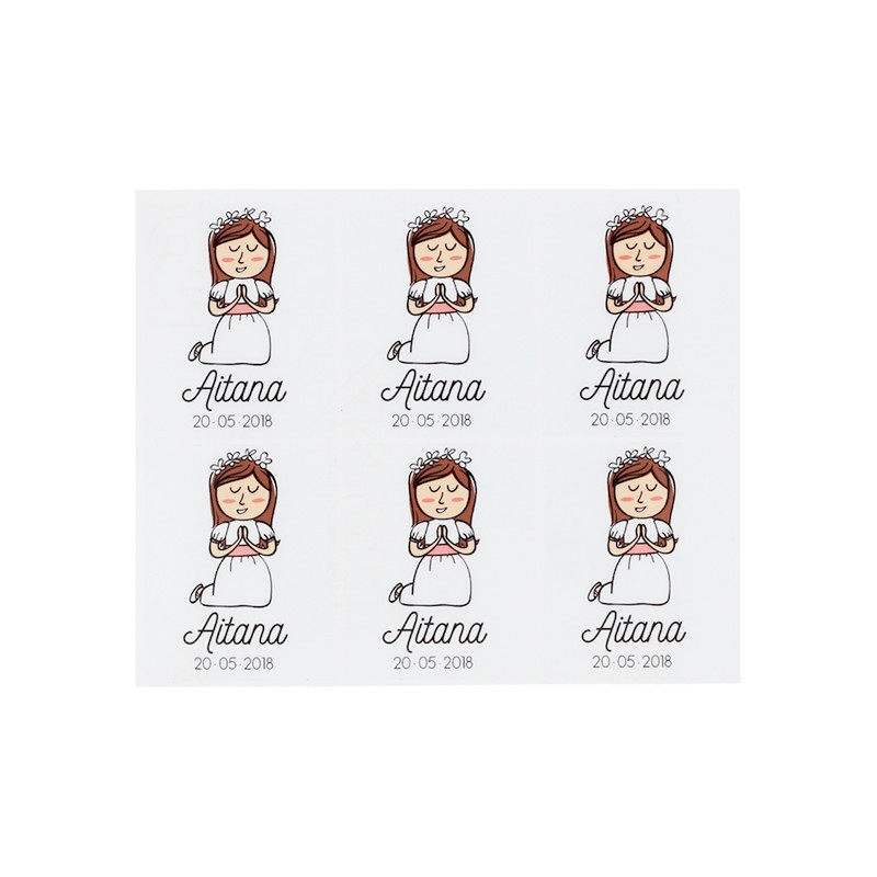Packung mit 20 Aufklebern zum Personalisieren, 3,9x4,8cm, für Kommuniongeschenke für Mädchen. Diese Aufkleber mit einem jugendlichen und trendigen Design sind nur in unserem Online-Shop erhältlich. Das Beste von allem ist, dass du sie mit dem Namen des Mädchens und dem Datum der Kommunion personalisieren kannst. Auf diese Weise kannst du originelle und einzigartige Kommunionsgeschenke machen. Es handelt sich um rechteckige Aufkleber mit einem transparenten Hintergrund. Sie sind auf wasserfestes Plastikpapier gedruckt und haften perfekt auf verschiedenen Oberflächen wie Plastik, Glas, Karton... Um diese Aufkleber zu kaufen, musst du mindestens 2 Packungen auswählen.