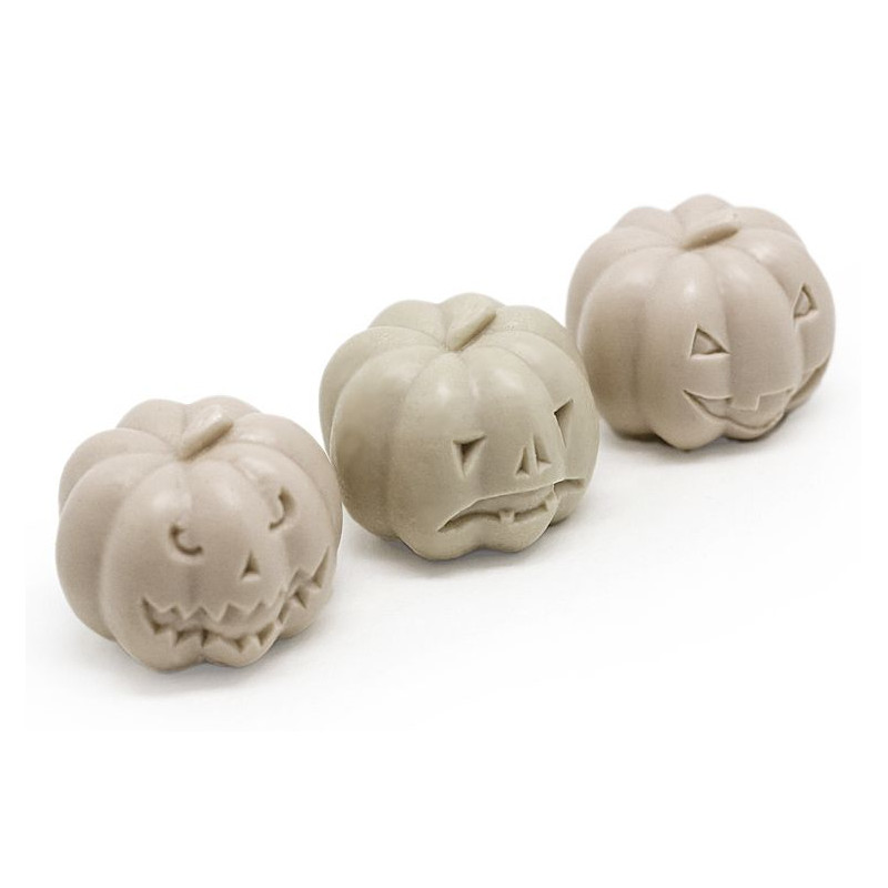 3 Halloween-Kürbisse zum Herstellen von Seifen, Kerzen und Bastelarbeiten. Sie ist aus Silikon und sehr einfach zu benutzen! Es handelt sich um eine Form mit 3 Vertiefungen, mit der Sie 3 Mini-Kürbisse mit jeweils unterschiedlichen Gesichtern herstellen kann. Da sie aus Silikon besteht, zeichnet sie sich durch ihre Widerstandsfähigkeit, Antihaftwirkung und Flexibilität aus und ist daher sehr leicht zu handhaben. Für die Herstellung von Seife brauchst du diese Form, Glycerinseifenbasis, Glycerinseifenfarbe und aromatische Essenzen. Du musst nur die Seifenbasis schmelzen, ein paar Tropfen der Essenz und der Farbe hinzufügen und die Form füllen. Die Herstellung ist sehr einfach und das Ergebnis ist spektakulär - probier es doch mal aus!