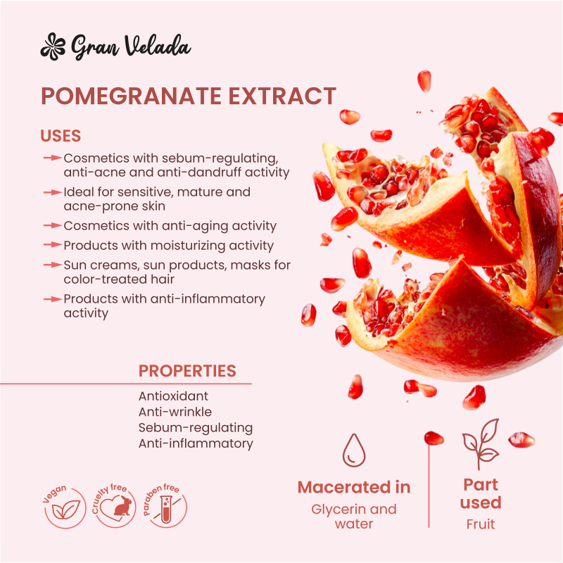 Granatapfelextrakt, reich an Antioxidantien, ideal zur Bekämpfung von Falten. Der Granatapfelextrakt, den Sie hier kaufen können, ist eine Mazeration der Früchte mit Wasser und Glycerin. Es enthält Vitamine und Mineralstoffe und kann als Zutat in Cremes, Stärkungsmitteln, Mizellenwasser, Shampoos, Masken, Sonnenprodukten, Sonnenschutzmitteln usw. verwendet werden. Granatapfelextrakt hat aus kosmetischer Sicht sehr relevante Eigenschaften. Es zeichnet sich durch seine antioxidative Wirkung und seine talgregulierenden und entzündungshemmenden Eigenschaften aus, weshalb Granatapfelextrakt ideal für Aknehaut, empfindliche Haut und reife Haut ist. Die empfohlene Verwendungsdosis von Granatapfelextrakt in Kosmetika beträgt 0,5 bis 5%. Das Literformat wird auf Anfrage bestellt. Es gibt nicht immer eine sofortige Verfügbarkeit, so dass sich die Lieferzeit verzögern kann.