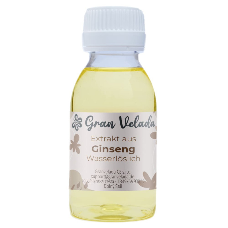 In Gran Velada können Sie Ginseng-Extrakt kaufen , mit dem Sie hausgemachte Cremes und Kosmetika anreichern können. Es ist ein wasserlöslicher Extrakt, der durch Mazeration in Glycerin und Wasser der Wurzel von Panax Ginseng gewonnen wird. Dieser kosmetische Inhaltsstoff hat ein transparentes, leicht trübes flüssiges Aussehen zwischen gelb und bräunlichgelb.