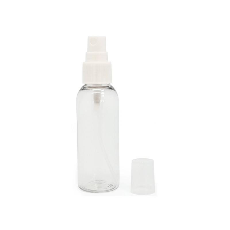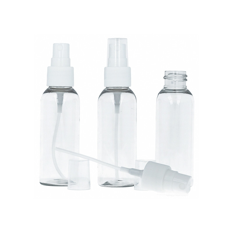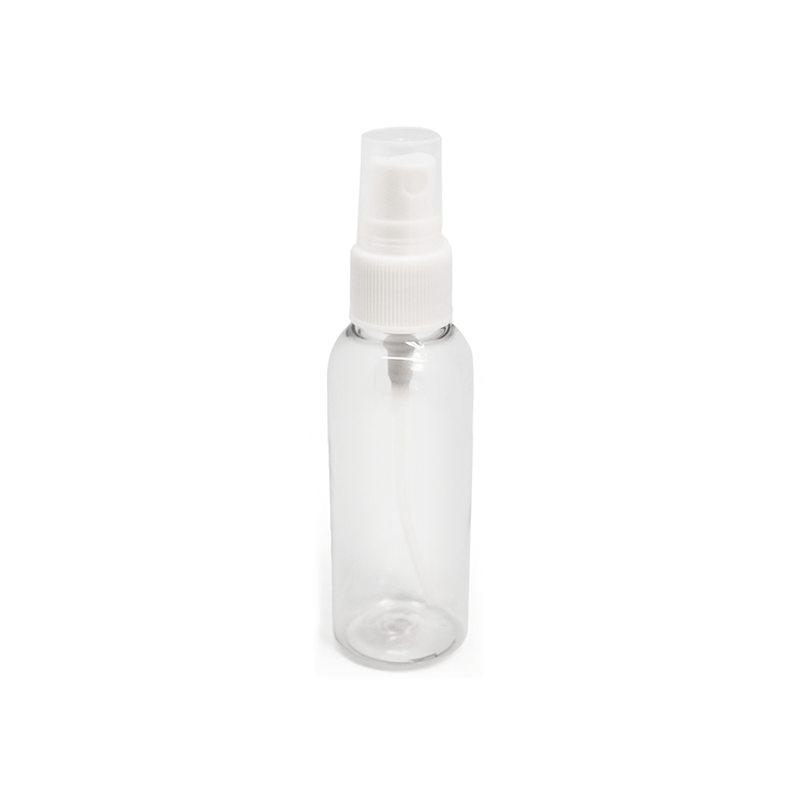 50-ml-PET-Flasche mit weißem Zerstäuber zur Verpackung verschiedener Produkte. Sie können wiederverwendet und recycelt werden. Sie werden leer verkauft und bestehen aus einem transparenten, kreisrunden Behälter, einem weißen, aufschraubbaren Zerstäuber aus Kunststoff mit Sprühkopf und einer transparenten Schnappkappe, mit der die Flasche vollständig verschlossen werden kann, um zu verhindern, dass die Flüssigkeit im Inneren verschüttet wird oder ausläuft. Dieses Flaschenmodell eignet sich hervorragend zum Verpacken: