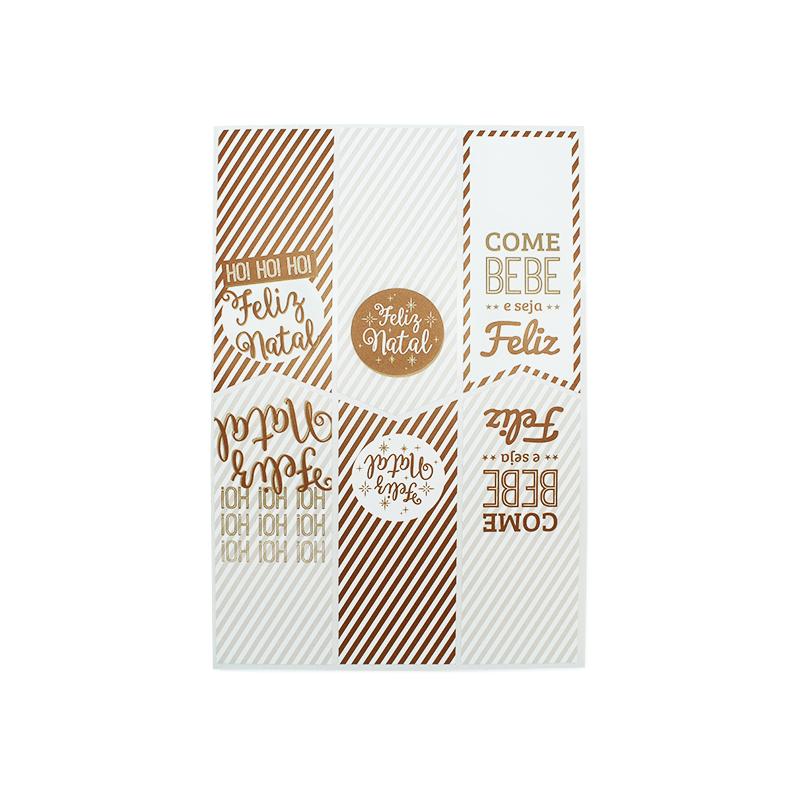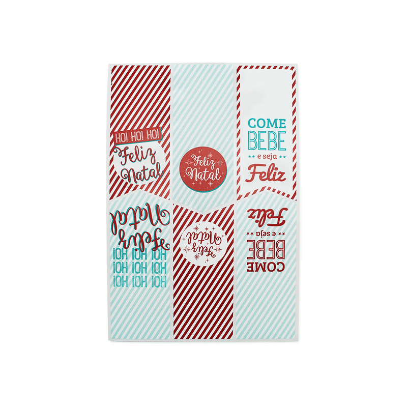 Aufkleber mit Weihnachtssätzen, ideal zum Dekorieren von Geschenken. Sie sind in drei verschiedenen Farbkombinationen erhältlich: Karamell und Schokolade, Rot und Grün sowie Türkis und Kastanienbraun. Sie werden in Blisterpackungen mit jeweils sechs Aufklebern verkauft. Sie lasen die folgenden Sätze: "Ho! Ho! Ho! Frohe Weihnachten"; "Frohe Weihnachten"; und "Essen, trinken und glücklich sein." Sie sind länglich, so dass sie als Etiketten dienen, um Taschen mit Details zu schließen. Maße: 5 cm breit x 13 cm hoch