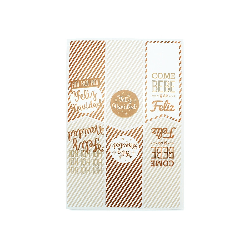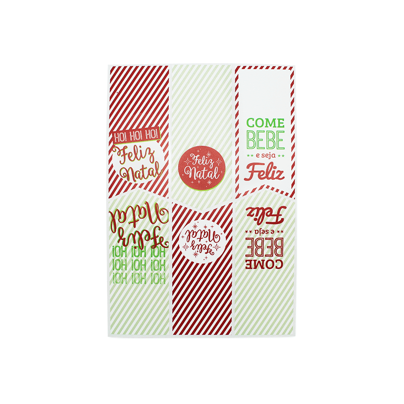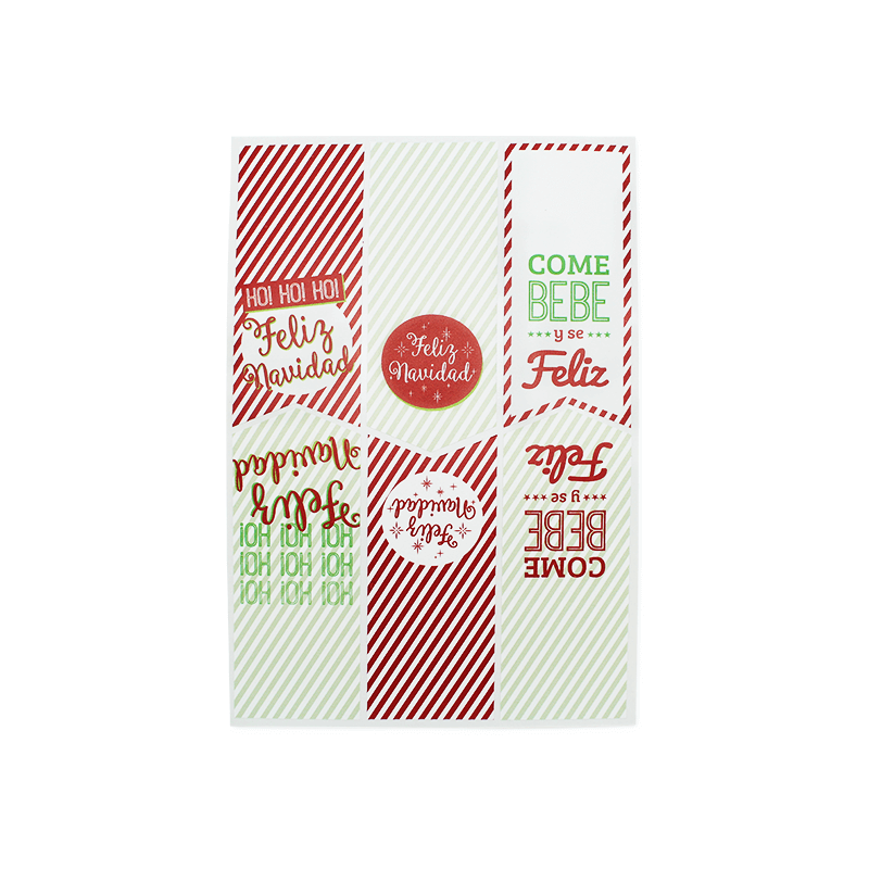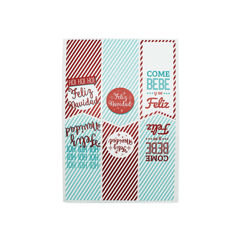 Aufkleber in Form eines Bandes, länglich und rechteckig, die sich perfekt als Verschluss oder zum Dekorieren von Geschenken des Weihnachtsmanns eignen. Und es sind Aufkleber mit Weihnachtssätzen, auf denen zu lesen ist: "Ho! Ho! Ho! Frohe Weihnachten"; "Frohe Weihnachten"; und "Essen, trinken und glücklich sein." Dieser letzte Aufkleber ist großartig, wenn Sie daran denken, etwas zu geben, das mit der Welt der Gastronomie zu tun hat. Zum Beispiel können Sie damit Gourmet-Körbe oder -Taschen mit Wein- oder Spirituosenflaschen dekorieren.