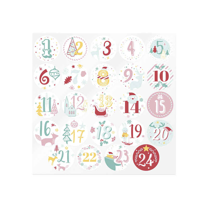 Blister mit 24 Aufklebern zum Basteln Ihres eigenen Adventskalenders, 3,5 cm Durchmesser. Sie sind rund und die klassischen Farben von Weihnachten überwiegen: Grün, Rot und Gelb. Die Adventskalender-Aufkleber tragen die Zahlen von 1 bis 24 und sind mit verschiedenen Weihnachtsmotiven verziert. Die Aufkleber, die Sie in Gran Velada kaufen können, zeichnen sich durch ihre Widerstandsfähigkeit und Qualität aus. Sie haften perfekt auf verschiedenen Oberflächen (Pappe, Papier, Kunststoff, Glas, Aluminium...) und sind wasserabweisend. Holen Sie sich diese Aufkleber und gestalten Sie einen schönen Adventskalender!