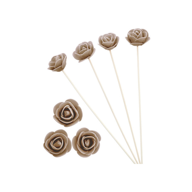 Elegante und sehr dekorative Blumen-Mikadostäbchen. Es handelt sich um saugfähige Stäbchen mit Aroma-Diffusor-Blüten für Mikados, bestehend aus einem Rattan-Holz-Stäbchen, das mit einer hellbraunen Schaumstoffrose versehen ist. Das charakteristischste Merkmal der Diffusoren mit Blumen ist, dass es die Blumen sind, die für die Verbreitung des Aromas des Mikados verantwortlich sind. Der Stab wird mit der Essenz imprägniert, die die Blume erreicht, und so bleibt das Aroma länger erhalten. Aufgrund ihrer attraktiven Rosenform eignen sie sich hervorragend für die Herstellung dekorativer Mikados. Die Rattan-Mikadostäbchen mit Blumen sind in verschiedenen Farben erhältlich. Einzeln erhältlich