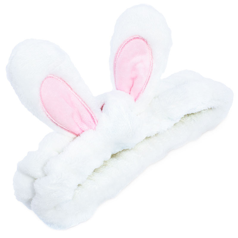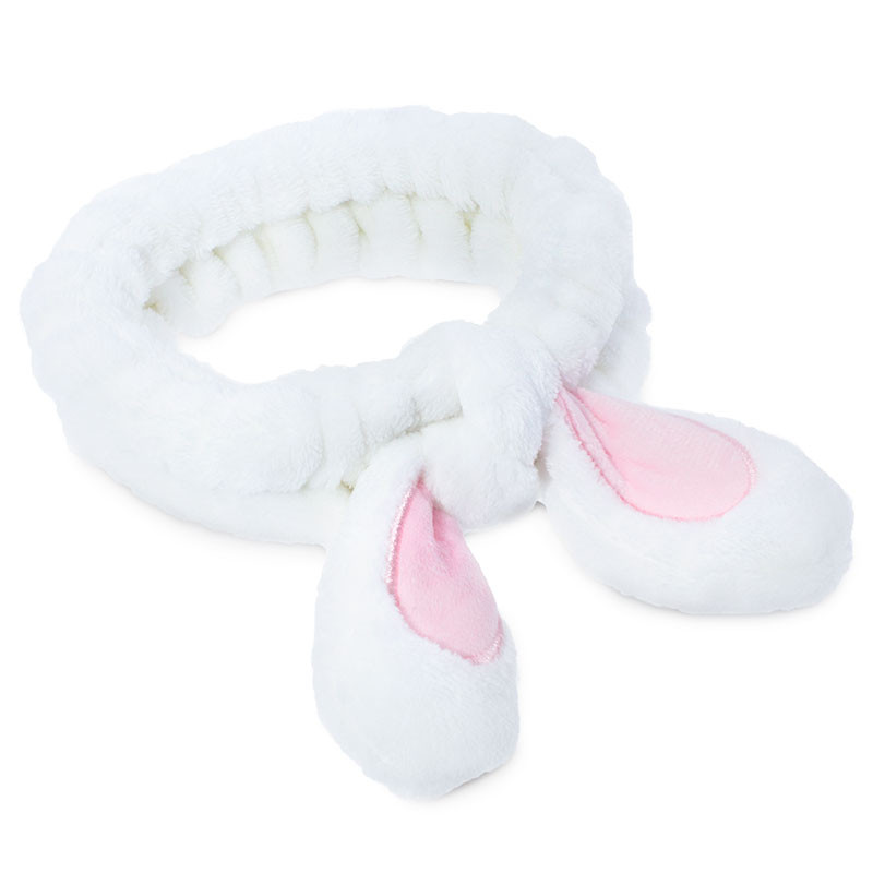 Dieses Make-up-Stirnband besteht aus feinem und seidigem Plüsch, einem Stoff, der Stofftieren oder Fleece sehr ähnlich ist. Es ist ein weißes Gummiband, das mit Hasenohren geschmückt ist. Die Ohren haben einen Draht im Inneren, um sie zu formen.