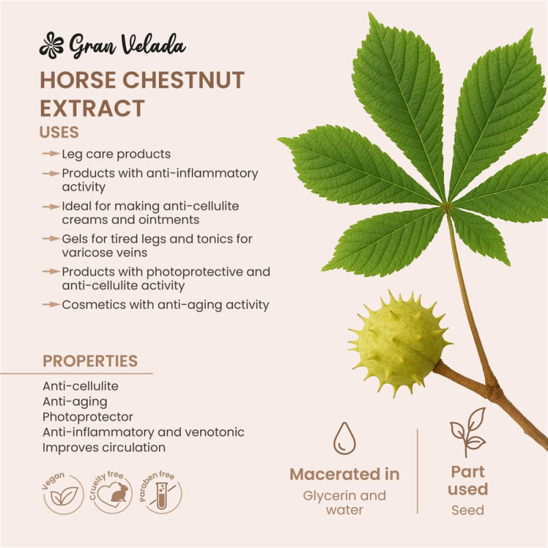 V Gran Velada si môžete kúpiť vo vode rozpustný extrakt z pagaštanu konského , maceráciu, ktorá sa získa zmiešaním semien tohto stromu s vodou a glycerínom v rovnakých častiach. Neobsahuje parabény a s ním môžete formulovať širokú škálu kozmetiky.