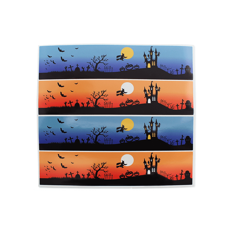 V spoločnosti Gran Velada sme exkluzívne pre teba navrhli niekoľko originálnych halloweenských nálepiek. Sú to veľmi univerzálne a viacúčelové nálepky s najstrašidelnejšou potlačou. Netopiere, strašidelný hrad, cintorín so živými mŕtvymi, zlá čarodejnica letiaca nad oblohou na metle a zlovestné tekvice dávajú tvar našej ilustrácii. Môžeš s nimi ozdobiť sviečky na Halloween, vyzdobiť lampióny alebo vytvoriť jedinečné držiaky na sladkosti.